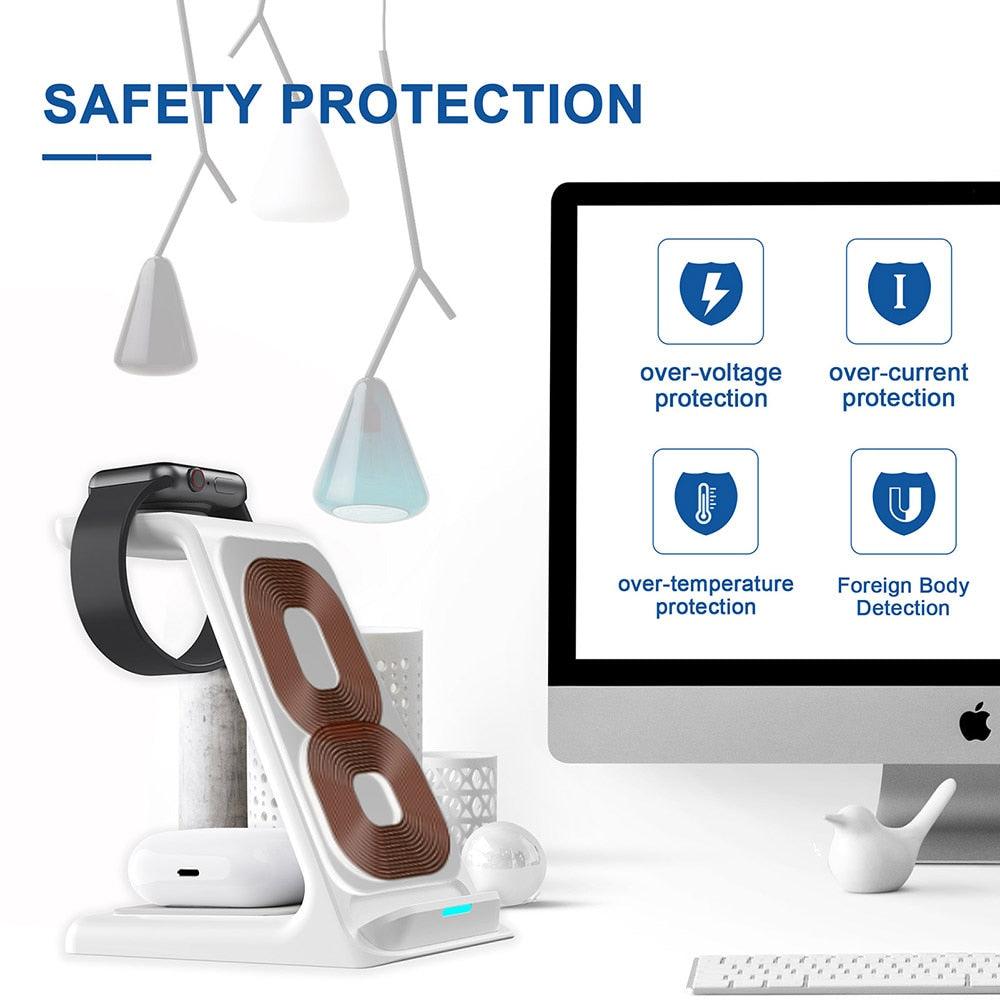 Our new 3 in 1 20W Wireless Charger Stand Dock is the solution to your charging woes. With our industry-leading dual charging coil design, you'll experience nonstop, uninterrupted power supplied to your devices without any worries about mismatches or overheating. Featuring a maximum of 20W output, you can simultaneously charge three of your favorite Apple products: Watch 7, Airpods and iPhone 14 13 12 11 XS XR X 8. Plus, with the built-in anti-slip silicone pads on both the bottom and base of the dock, you can rest assured that all your devices will remain firmly in place while quickly charging at their highest capacity. Our Wireless Charger Stand Dock also comes with advanced safety measures such as temperature control and voltage protection along with built-in ventilation holes to ensure safe and reliable usage. Get ready to eliminate messy cords and keep your desk or nightstand organized without ever compromising on power again!