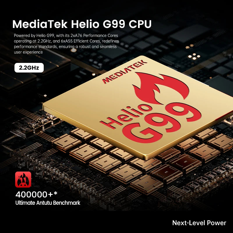 MediaTek Helio G99, 2 Cortex A76 cores, 6 A55 cores, Mali-G57 MC2 GPU, 6 nm process technology |