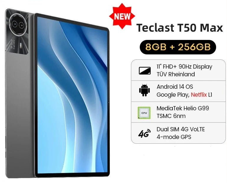 NEW Teclast T50 Max Tablet 11" 90Hz Display, Android 14 MTKG99 8GB 256GB 4G LTE 8000mAh 18W Fast Charging