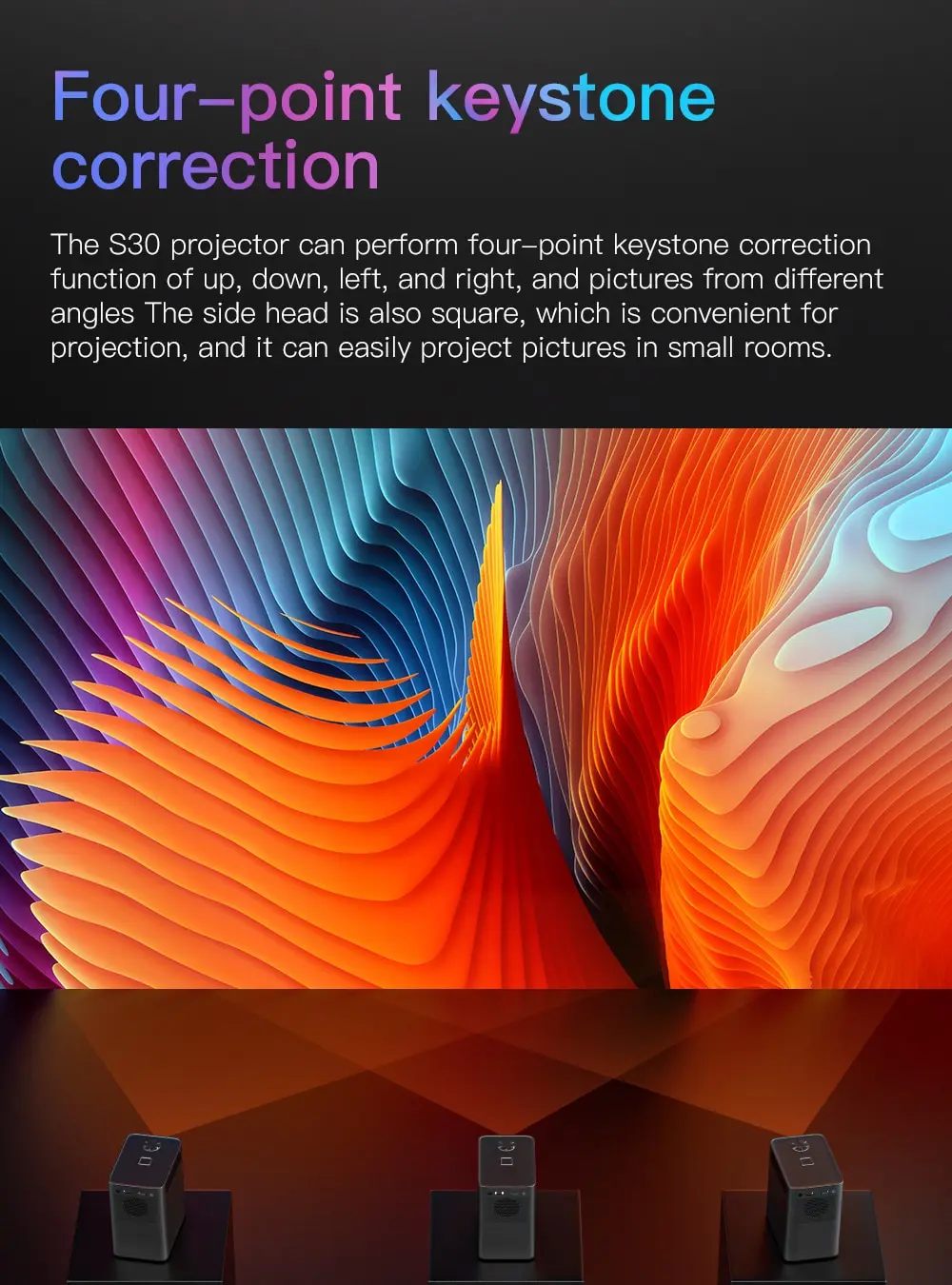 S30 projector can realize up, down, left, right, different angles of the picture four trapezoidal correction function. The side head is also square for easy projection and can easily project pictures in the small room.