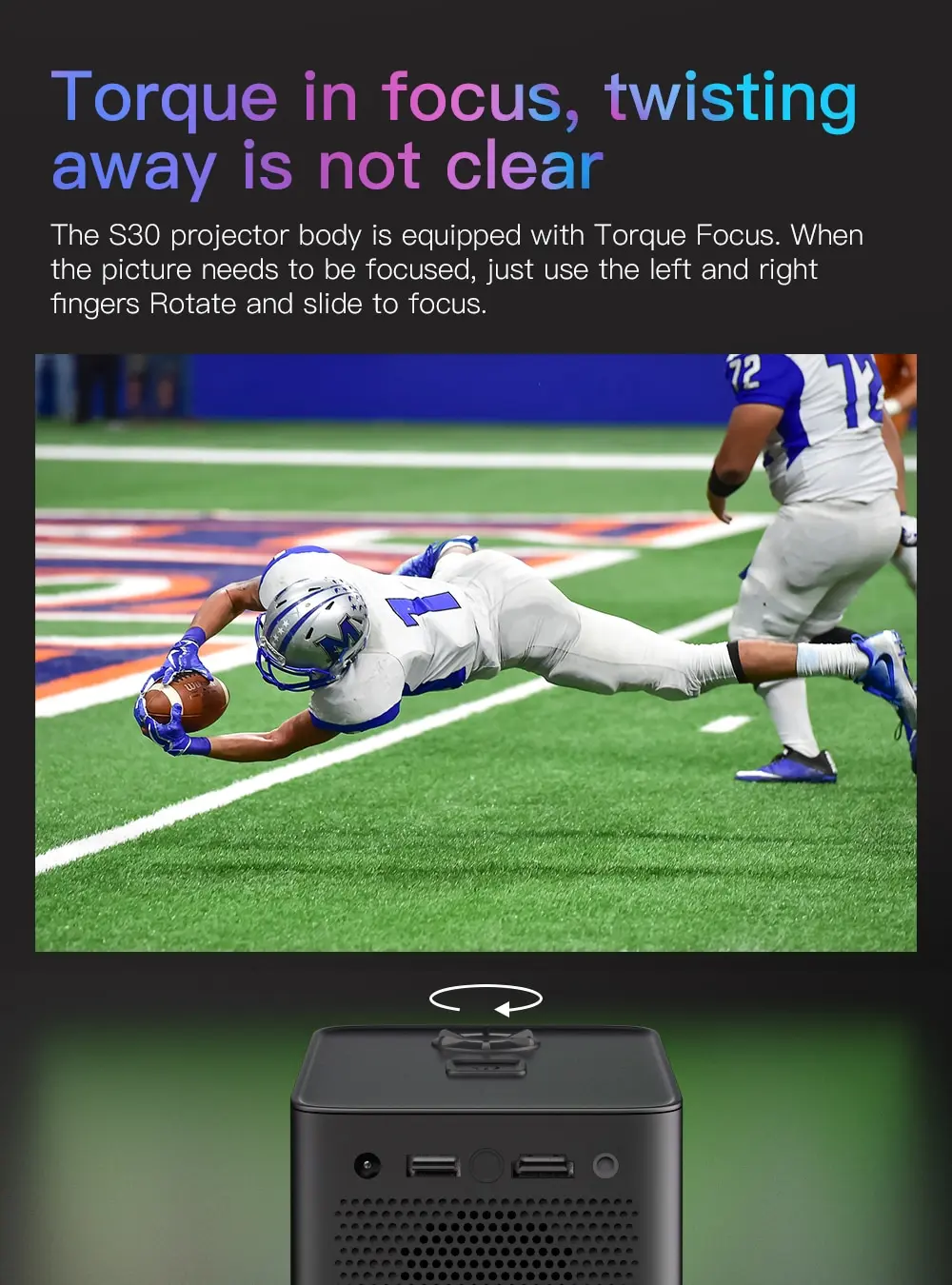 The S30 projector body is equipped with torque focusing. When the picture needs to be focused, just rotate and swipe with your left and right fingers to focus.