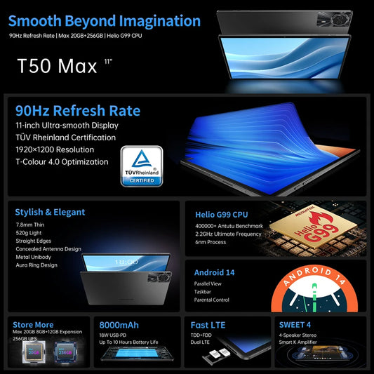NEW Teclast T50 Max Tablet 11" 90Hz Display, Android 14 MTKG99 8GB 256GB 4G LTE 8000mAh 18W Fast Charging