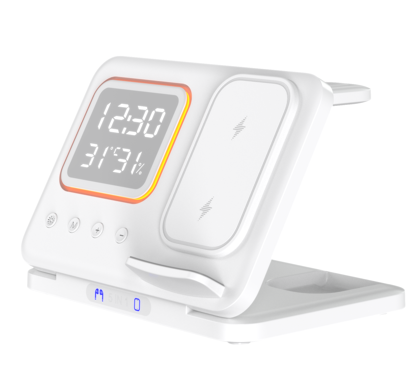 5 in 1 Fast Charging Desktop Standing Magnetic Wireless Charger with Clock and LED Night Light For Mobile Phones, Earphones, Smart Watch, iPhone, Airpod, iWatch, Earbuds, etc |